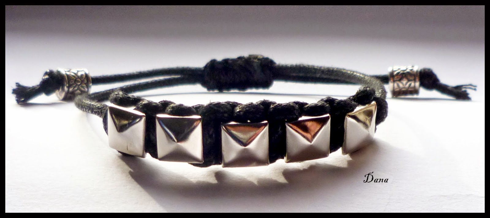 Bransoletki wykonane z sznurków woskowanych biały 1,5 mm ,niebieski 2mm,czarny 2mm, czarny i niebieski 1mm.Ćwieki w kolorze srebrnym kwadratowe i okrągłe w kolorze złotym.Guzik w kolorze złotym.Bransoletki niebieska i czarna z regulacja, biała o długości 19cm.